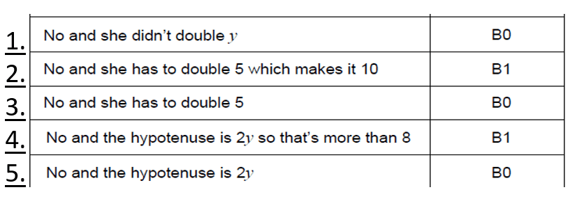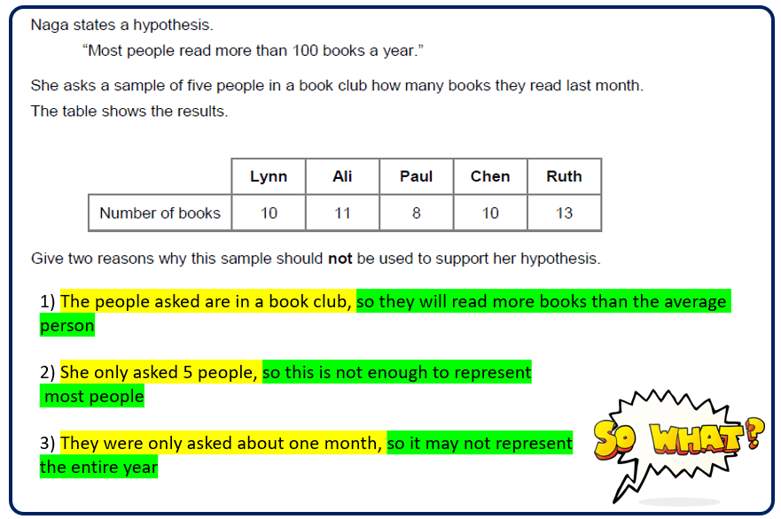 “So what?!” is the name of the first technique. It’s the idea that students need to aware that when giving a written response, or are being ask to “show that” something is true that they need to include the “so what”. The part highlighted in yellow are common responses from students, the bit in green, the “so what”, is often what’s missing: