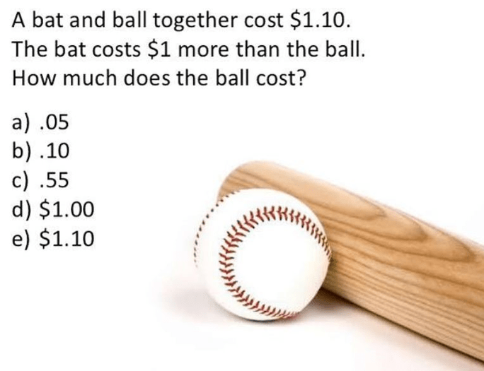 A typical question used to highlight the issues with system 1 thinking is the bat and ball question: